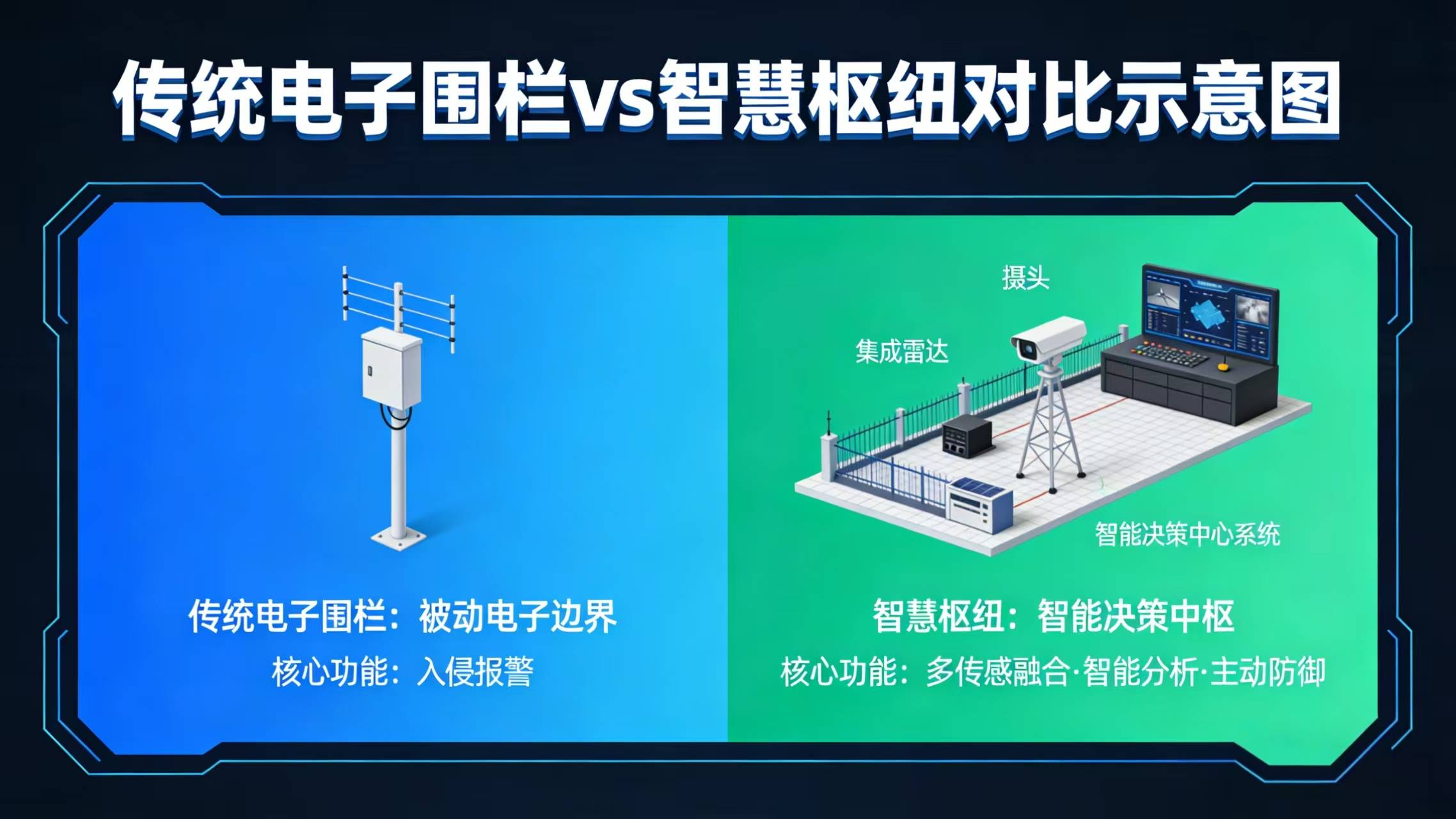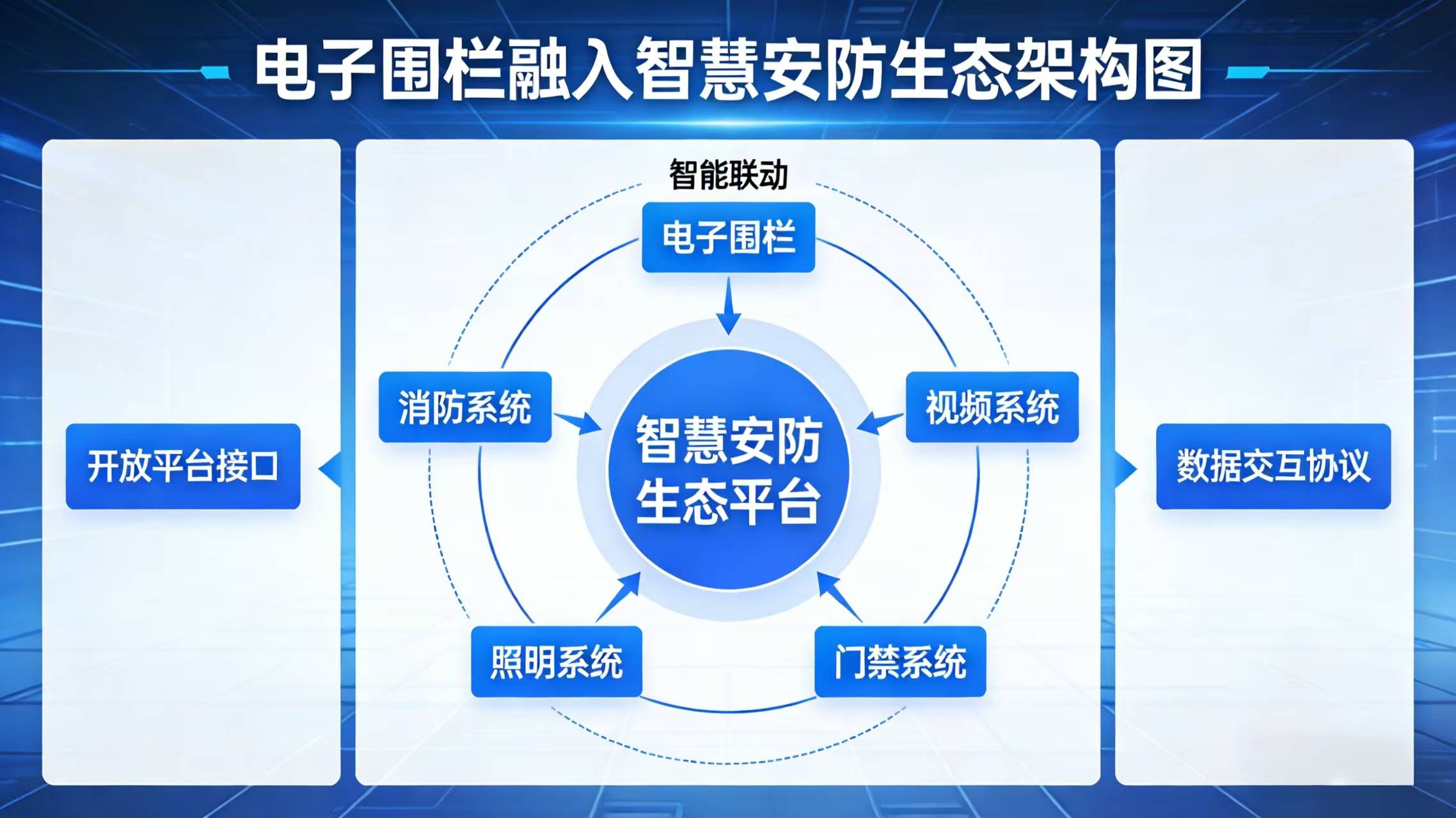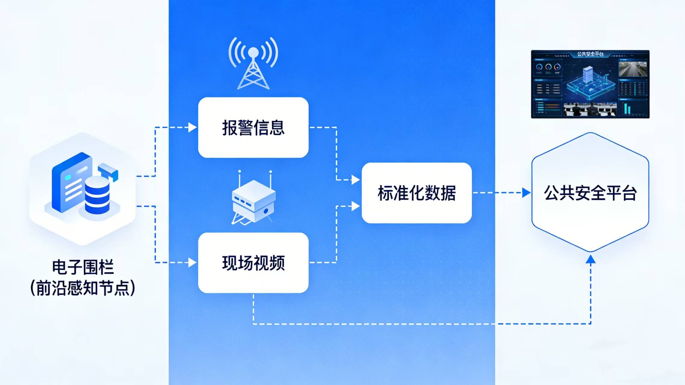 一个标准化、智能化、可联网的电子围栏系统,能够将其精准的报警信息与现场视频,转化为可被公共安全平台直接调用的标准化数据,使社会安保力量成为公共安全体系中可信、可靠的可调度资源。